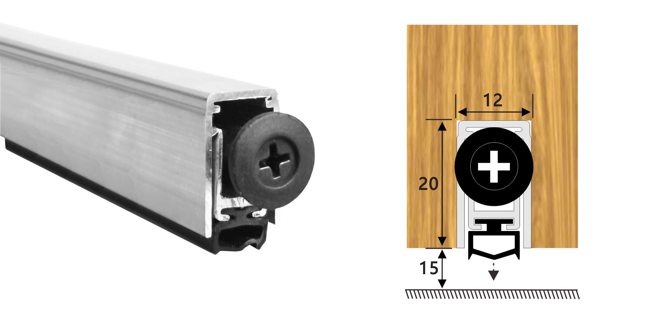 嵌入式門底自動升降式密封器,四連桿機構,適用于門扇內(nèi)開槽的門。安裝時需在門底有一個20mm*12mm的通槽,將產(chǎn)品放置其中,將兩端蓋板和密封器用螺絲固定(或用螺絲從密封條底部向上固定),使用本產(chǎn)品不影響門的整體風格。