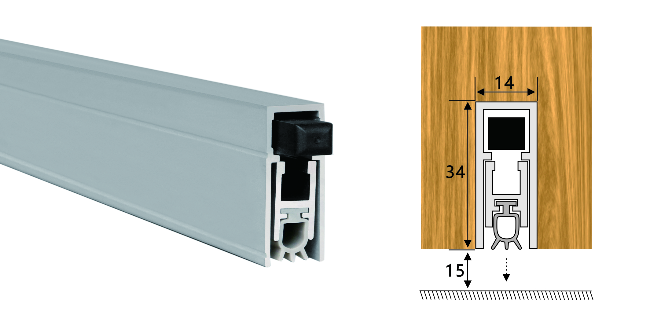 嵌入式門底自動升降式密封器,M型彈簧結(jié)構(gòu),適用于門扇內(nèi)開槽的門。安裝時(shí)需在門底有一個34mm*14mm的通槽,將產(chǎn)品放置其中,將兩端蓋板和密封器用螺絲固定,使用本產(chǎn)品不影響門的整體風(fēng)格。