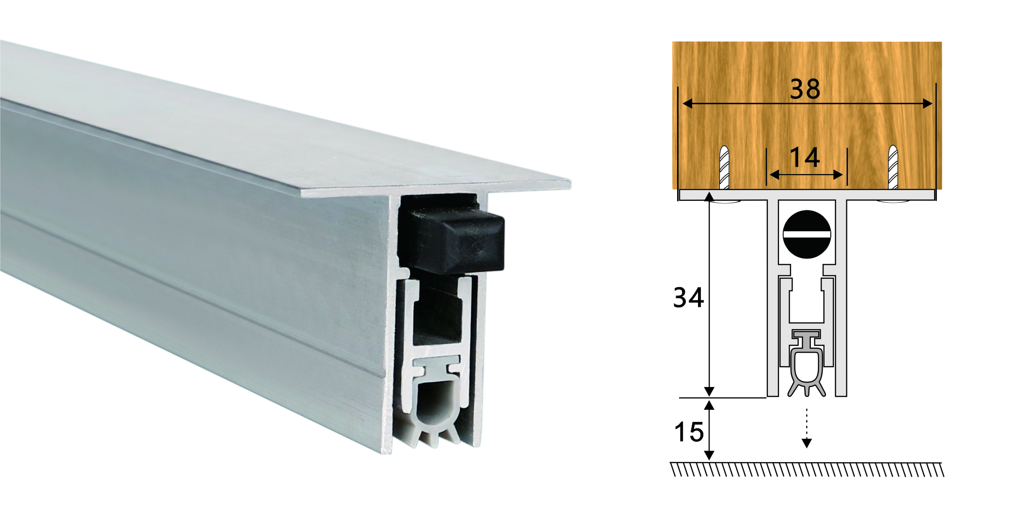 為省去門底開槽的工作,特別設(shè)計了B03的擴展應(yīng)用的門底自動升降式密封器。只需設(shè)計時將門的高度做短34~35毫米,將自動門底條用螺絲從兩翼上直接固定,即可。其作用與B03一樣,密封條自動上升,膠條與地面無摩擦。