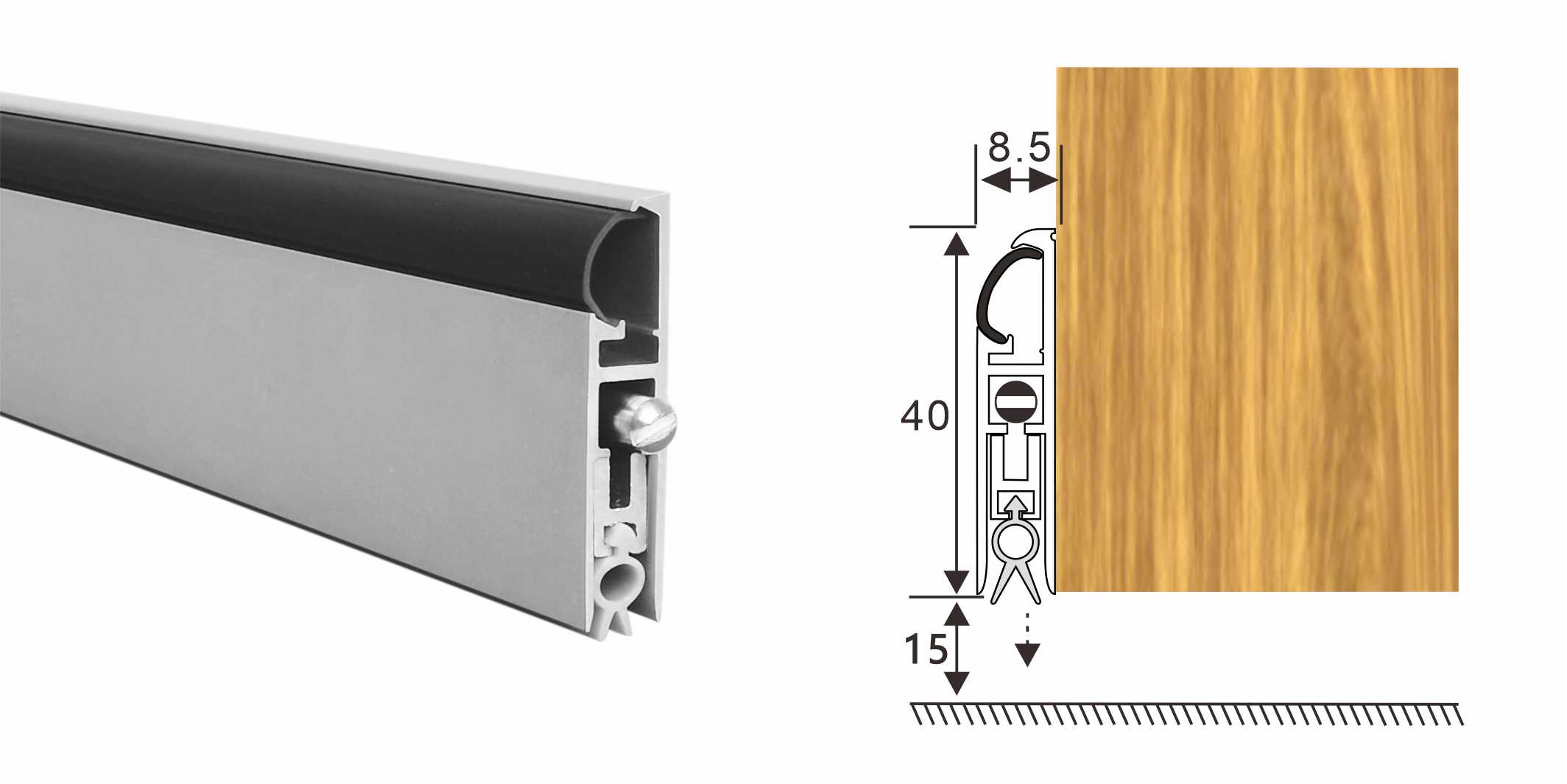 外裝式門(mén)底自動(dòng)升降式密封器,安裝在門(mén)底表面,適用于后補(bǔ)工程,如已安裝到位的門(mén)需要增加隔音,隔溫,防